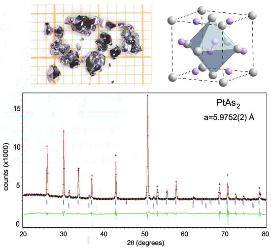 X-ray diffraction data from powdered PtAs2 single crystals, with a small amount of lead identified as originating from the growth flux. Black crosses, red lines, and green lines represent the observed data, fitting curve and the difference between the observed and fit (residuals), respectively. The insert shows the unit cell of PtAs2, with a Pa-3 cubic crystal structure (grey and pink spheres represent Pt and As atoms, respectively.
