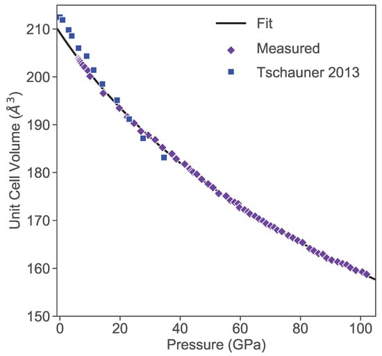 Figure 1 presents powder X-ray diffraction data measured using the synthetic PtAs2 crystals at ambient pressure, with fitting performed using the previously reported pyrite structure [19]. Refinement of the diffraction spectrum yields a lattice constant of 5.9752(2) Å, which is consistent with the previous results [20]. Powder X-ray diffraction spectra of PtAs2 measured in the DAC were fit to extract unit cell dimensions as a function of pressure, plotted as volume (i.e., lattice parameter ) in Figure 2. PtAs2 does not undergo any structural phase transition within the measured pressure range, rather showing a continuous decrease in the unit cell volume as the pressure increases to 150 GPa. This evolution follows the Birch–Murnaghan isothermal equation of state (EOS):
