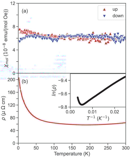A study of the magnetic susceptibility for synthesized PtAs2, presented in Figure 3a, shows paramagnetic behavior on both warming and cooling curves, with no evidence of magnetism. The lack of temperature dependence is similar to previous reports for PtAs2 as well as RhAs2 and IrAs2 [21], although the historical study reports a diamagnetic response. Figure 3b presents the electrical resistivity of PtAs2 at ambient pressure, which is also lacking any significant features. At high temperatures, the transport behavior is that of a semimetal where resistivity is nearly flat, exhibiting a slight decrease on cooling down to a broad minimum centered near 200 K, followed by an increase with moderately activated behavior. Fitting to a standard Arrhenius activated behavior using through the range 50–200 K as illustrated in the inset, we obtain a rather small value for the thermally activated energy gap = 3.96 meV. Below 50 K, deviates from activated behavior, which indicates that there may be another conduction channel or scattering mechanism at low temperatures that requires further investigation.