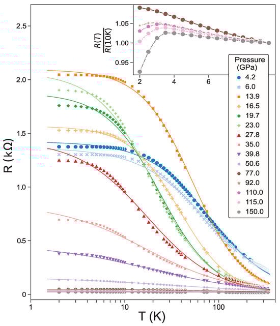 Resistance of single crystal PtAs2 as a function of applied pressures in the range 4.2–150 GPa. Data points represent experimentally measured data, and solid lines are the results of the phenomenological power law fit to Equation (2). The inset shows a zoom of the low-temperature resistance at pressures (top to bottom) of 77, 92, 110, 115, and 150 GPa, respectively, highlighting the drop in resistance due to the onset of a superconducting state.
