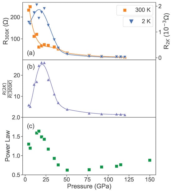 The evolution of resistivity with applied pressure is quantified in Figure 5. As shown in panel (a), the non-monotonic evolution is evident when comparing the evolution of resistance values at 2 K and 300 K, which exhibit different dependence as a function of pressure. Normalizing the absolute changes by plotting their ratio in panel (b) reveals a striking peak near ∼20 GPa. The temperature dependence of resistivity qualitatively changes with pressure evolution and exhibits deviations from simple semiconductor-like activated behavior at low temperatures, suggesting there is a more complex behavior that is not captured by a simple Arrhenius function. To quantify this evolution, we apply an empirical power law fit of the form