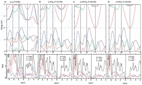 Low-energy electronic band structure (top panels) and electronic density of states (bottom panels) of PtAs2 as a function of unit cell density, using lattice parameters of (a), (b), (c), (d), where is the lattice constant for the ambient pressure unit cell. The corresponding value of pressure P for each calculation is estimated based on Equation (1). Colors in panels (a–d) represent distinct band contributions.