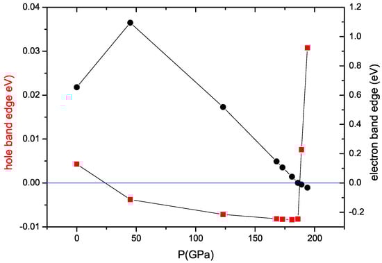 Position of electron (circles) and hole (squares) band edges with respect to the Fermi energy (E = 0) as a function of calculated pressure from DFT band structure calculations.