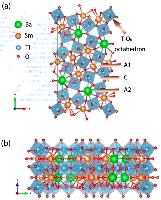 - Okudera, H.; Nakamura, H.; Toraya, H.; Ohsato, H. Tungsten Bronze-Type Solid Solutions Ba6−3xSm8+2xTi18O54 (x = 0.3, 0.5, 0.67, 0.71) with Superstructure. J. Solid State Chem. 1999, 142, 336–343. [Google Scholar] [CrossRef]