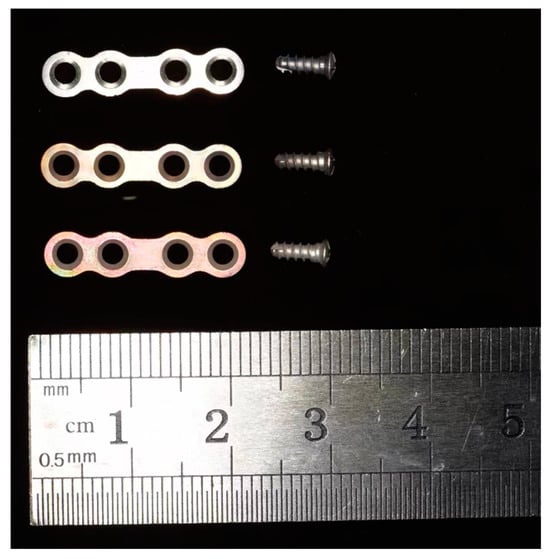 Three types of magnesium alloy plates and screws. Up: Group A, without surface coatings. Middle: Group B, with the fluoride coating. Bottom: Group C, with the duplex fluorinated and ZrO2 coatings.