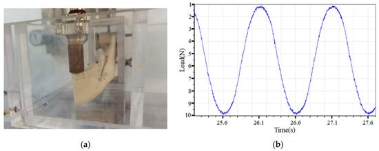 Loading forces were applied on the incisor edge (a). The frequency of the stress cycle was 1 Hz, and the loading force was varied from 1–10 N (b).