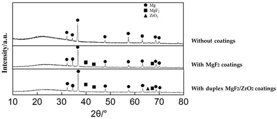 X-ray diffraction patterns of Mg alloy without coatings, Mg alloy with MgF2 coatings, and Mg alloy with duplex MgF2/ZrO2 coatings.