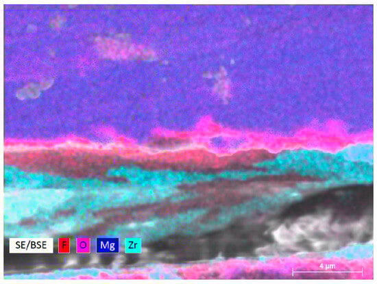 Surface morphologies of the samples in the different groups are shown in Figure 4a–c. The results of energy-dispersive spectroscopy (EDS) showed that the fluorinated and ALD ZrO2 coatings were successfully applied to the Mg alloy surface (Figure 4d–f). The XRD pattern of the test samples are shown in Figure 5. According to standard JCPDS data, diffraction peaks for the formation of MgF2 were found at 2θ = 40.4°, 43.7°, and 67.7°, whereas that for the formation of ZrO2 crystalline anatase was observed at 2θ = 65.8°. Cross-sectional morphology of Group C clearly presented with the interfaces of outer ZrO2, intermediate MgF2, and Mg substrate (Figure 6).