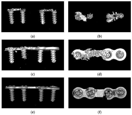 Micro-CT scan of degradation of Mg alloy plates and screws in the different groups after the 4 week in vitro experiment. ((a,b): Without surface coatings. (c,d): With the fluorinated coating. (e,f): With the duplex fluorinated and ALD ZrO2 coatings.).