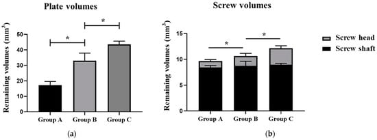 Micro-CT analysis of the remaining volumes of the Mg alloy plates and screws in the different groups after the 4-week in vitro test. (a) Comparison of the remaining plate volume; (b) Comparison of the remaining screw volume. Group A, without surface coatings; Group B, with the fluorinated coating; Group C, with the duplex fluorinated and ALD ZrO2 coatings. *, p < 0.05.