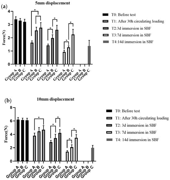 Comparing the loading forces of the different groups of the magnesium alloy plate–screw systems at different time points. ((a). 5 mm displacement; (b). 10 mm displacement). Group A, without surface coatings; Group B, with the fluorinated coatings; Group C, with the duplex fluorinated and ALD ZrO2 coatings. *, p < 0.05.