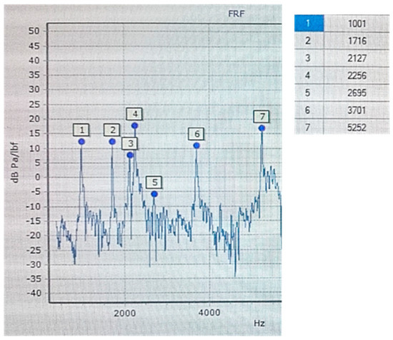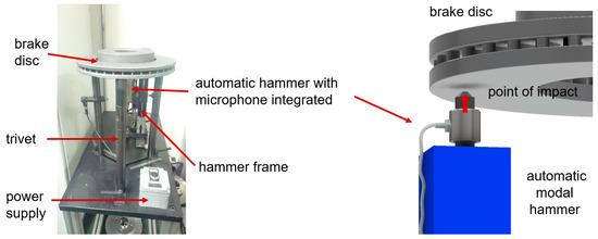 An Olympus (Shinjuku, Japan) DL 38 Plus device equipped with two broadband heads, VL-M110-RM and VT-V156-RM, with a nominal characteristic of 4 MHz was used for the ultrasonic tests. The VL-M110-RM heads were used to measure the longitudinal wave speed, while the VT-V156-RM heads was used to measure the transverse wave speed. The measuring device and heads used complied with the standards [36,37]. In order to determine the elastic properties of cast iron, density measurements were also carried out. The tests were carried out using the hydrostatic weighing method according to the standard [38]. Samples with dimensions of 5 mm × 10 mm × 10 mm were taken randomly from castings of each grade of cast iron and prepared on a CNC machine. The numerical modal analysis of the brake discs was carried out in the MSC Nastran simulation package. Actual tests of the natural frequency of brake discs (FRF analysis) were performed at the Itasonic 2010 station. The experimental modal analysis used involved forcing natural vibrations using a modal hammer and then recording and identifying the frequency response spectrum. The casting was vibrated with an automatic modal hammer of 0.1 kg and a head diameter of 15 mm. The emitted sound signal was recorded using a special industrial microphone with a frequency response of 100 Hz–10 kHz. The method for measuring the natural vibrations and an example graph from the frequency analysis (FRF) are shown in Figure 2 and Figure 3.