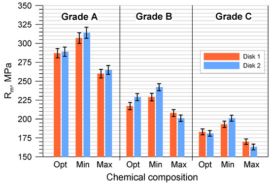 The average hardness and tensile strength of the tested cast iron grades with optimal compositions and the permissible minimum and maximum element contents are shown in Figure 4 and Figure 5. The tensile strength was determined indirectly on the basis of the RmK test results according to the methodology described in point. Based on the tests performed, it can be concluded that the highest hardness and tensile strength were obtained for grade A cast iron, and the lowest for grade C. At the same time, it should be emphasized that all manufactured grades met the requirements for minimum tensile strength (Grade A > 250 MPa, Grade B > 200 MPa and Grade C > 150 MPa). Analyzing the results in more detail (Figure 4 and Figure 5), it can be seen that the highest HB and Rm values corresponded to cast iron grades with the chemical composition MIN. Increasing the permissible element content to the MAX value resulted in a noticeable reduction in mechanical properties. In the case of grade A cast iron, the tensile strength decreased by approximately 45 MPa, and the hardness decreased by 7 HB. For B and C grade cast iron with MAX chemical composition, these properties decreased by 31 MPa and 14 HB and by 34 MPa and 11 HB, respectively.