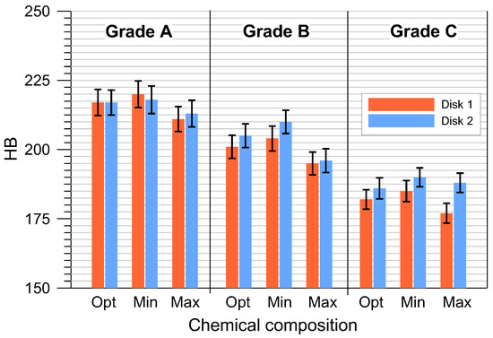 The determined changes in the mechanical parameters and their distribution were directly related to the degree of eutectic saturation SC of the individual cast iron grades and are important both for the design of brake discs and for the melting of cast iron. As is known, as the SC coefficient increases, the tensile strength and elastic properties of cast iron decrease, while its ability to dampen vibrations and resistance to thermal fatigue increases [16,18,27]. A comprehensive analysis of these properties, taking into account the technological aspects of cast iron melting, allows for the determination of critical values for which the designed brake discs meet the desired braking performance and appropriate NVH properties. Smelting cast iron for brake discs requires a high technological regime and constant control in order to maintain a narrow range of change for the SC coefficient—on average of ±0.02 (Table 1). Therefore, for the smelting of cast iron, a high-quality metal input is used, containing hematite pig iron, selected steel and circulating scrap, and certified and proven auxiliary agents (ferroalloys and carburizers). Moreover, in order to ensure a uniform structure and mechanical properties of the casting, as well as to reduce the tendency to whitening and the segregation of components, cast iron is modified when poured into molds.