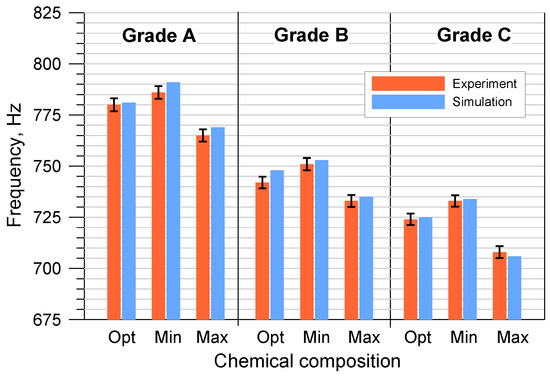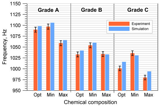 The results of the numerical modal analysis and the experimental measurements of the discs cast from the tested cast iron grades, taking into account the permissible minimum and maximum element contents, are presented in Figure 9 and Figure 10.