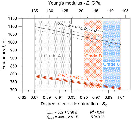 - An increase in the degree of saturation of eutectic cast iron from 0.87 to 1.01 resulted in a 21% reduction in Young’s modulus and a 10–11% reduction in the first natural vibration frequency of the brake discs.