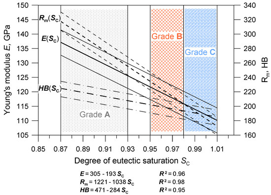 Based on the obtained research results, a database of cast iron material parameters was developed, intended for the numerical simulation of the natural frequency of brake discs in the Nastran software. The database includes average values of parameters and their ranges of changes corresponding to the limit chemical compositions of individual cast iron grades. An integral part of the database are the two charts shown in Figure 11 and Figure 12. They illustrate the relationships between the chemical composition, strength and elasticity of cast iron and the natural frequency of the discs. The areas highlighted in the drawings (hatched fields) determine the possible ranges of changes in the material parameters for discs cast from particular grades of cast iron. At the stage of developing the production database, functional relationships were determined between first natural frequency, chemical composition and mechanical properties of the tested cast iron grades. Correlations related to Poisson number were not determined because the υ values varied within too narrow a range. When starting the statistical analysis, it was assumed that from among various functions approximating the relationships f(E), E(SC), Rm(SC), HB(SC), the simplest formulas would be selected, for which the coefficient of determination R2 would be above 95%. The form of the obtained functions along with the values of the R2 coefficients and confidence interval (0.95) are presented in Figure 11 and Figure 12.