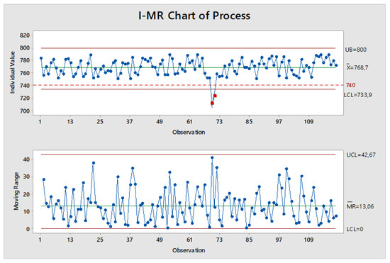 In order to more precisely verify the calculation results presented in the previous point, as well as to assess the stability of the production process, statistical quality control was performed using the I-MR (Individual–Moving Range) card. The monitored parameter was the first natural frequency of the implemented disc, the variability of which was determined on a sample of 120 castings. The measurements were carried out on castings selected randomly from the monthly production period. The developed I-MR control card is shown in Figure 15. The drawing also includes the upper and the lower limits of the NVH frequency range specified by the foundry’s customer.