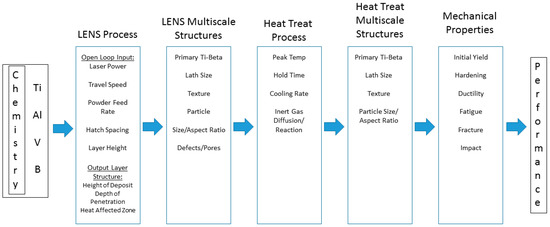 Chemistry, process, structure, property, and performance diagram for the laser-engineered net shaping (LENS) additive manufacturing process.