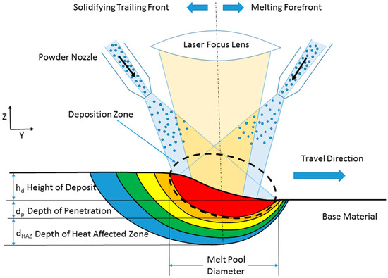 Schematic of the traveling deposition zone of the LENS blown powder method. The base material is either a starting material or a previous layer and is fixed. The deposition head travels to the right relative to the base material, as shown in this schematic. The dotted line represents the melt region, where the red color is the hottest region under the laser focal spot. The amount of the powder filler material determines the height of the deposition pass. The melt pool diameter is a function of laser power and travel speed, which in turn affects the depth of penetration and the heat-affected zone. The melting forefront experiences a different thermal history than the solidifying trailing front that generates a different microstructure.