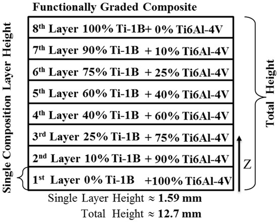 Schematic showing the layer composition of the Ti-6Al-4V/Ti-1B FGM produced by LENS.