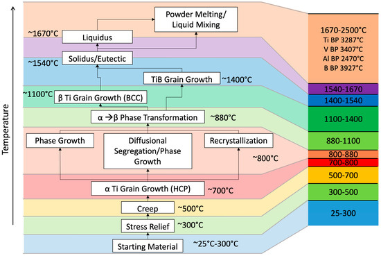 Schematic of different “events” that occur in the titanium functionally graded material as the temperature increases in the direction of the melting forefront. Please note that multiple multiscale structures can arise during the complex temperature history.