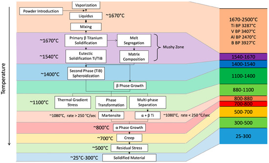Schematic of different “events” that occur in the titanium functionally graded material as the temperature decreases in the direction of the solidifying trailing front. Please note that multiple multiscale structures can arise during the complex temperature history.
