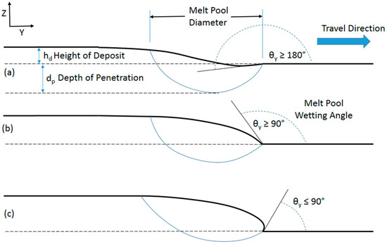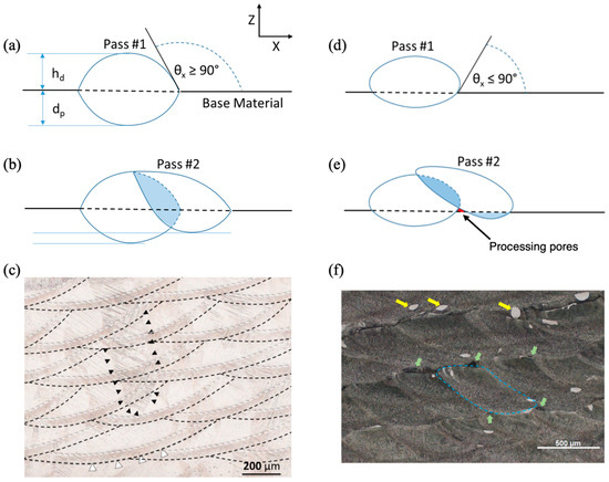 Figure 6 illustrates the three different angles that can arise from the leading edge of the deposition zone. Critical to porosity here is when the angle is less than 90°, as shown in Figure 6c. This angle of less than 90° can arise when overfilling of the powder occurs with respect to the travel speed of the pass as it is laid down. As Figure 6 illustrates, what one really desires is to have an underfilling or acceptable filling powder rate combined with the appropriate travel speed to garner a greater depth of penetration. Figure 7 compares cases when no pores will arise from acceptable filling or underfilling and when pores will arise from overfilling. Note the lack of depth of penetration in the cases of overfilling. Figure 7c,f also show bright-field optical micrographs of the material, showing the difference between the two cases when pores are present and when pores are not present.