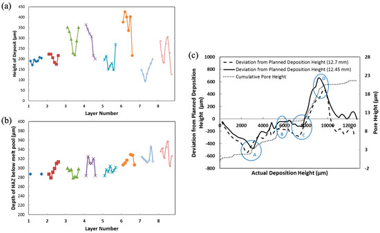 For each deposition layer pass in the eight-layer FGM, (a) the height of deposition pass, as measured by HAZ to HAZ and melt pool bottom to melt pool bottom between successive deposition passes. Symbols show successive passes within the same layer colors and symbols are from the same layer and correlate between (a,b). (b) The depth of the heat-affected zone (HAZ) as measured from the bottom of the melt pool. (c) Error accumulation between the planned and actual deposition height. Points A, B, C, and D indicate the control loop in situ modifications because of the porosity level.