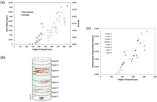 Process defects detected through X-ray computed tomography (CT). At fixed hatch spacing, the effect of the height of the deposit (hd) is shown versus (a) total process pore volume per pass for each layer. (b) An X-ray CT volume rendering showing process pore distribution (colored red) through the volume of a cylinder spanning all 8 layers. (c) Porosity per pass for each layer.