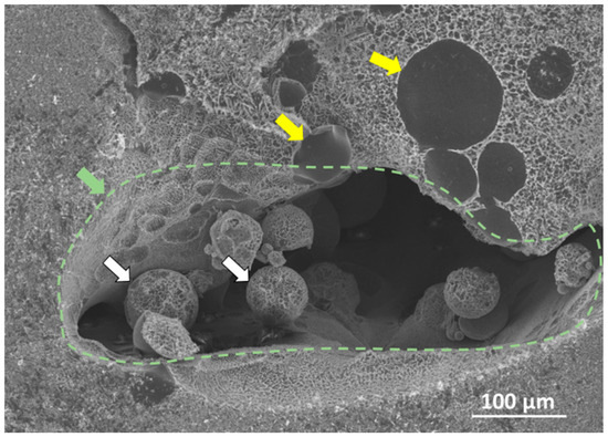 A processing defect is shown in a scanning electron microscope (SEM) image of a region in Layer 6. The yellow arrows point to unmelted Ti-6Al-4V powder; the white arrows point to unmelted Ti-1B powders; the green arrow and the green dashed line outline a single process pore corresponding to green arrows in Figure 7f.