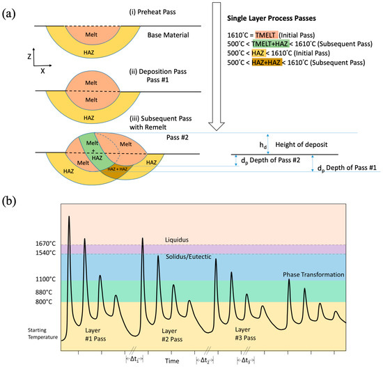 For acceptable passes, the schematic (a) shows a preheating pass (i), a single deposition pass (ii), and a subsequent pass (iii) illustrating the melt zone, heat-affected zone (HAZ), and base material. Please note that the depth of a particular pass can vary. We also show here that in just two lines of one pass, we have a potential for four unique temperature history-dependent microstructures, all with the same original chemistry. (b) A material point undergoes multiple excursions through the melting and phase transformation zones for titanium alloys due to 4 different passes with multiple lines.