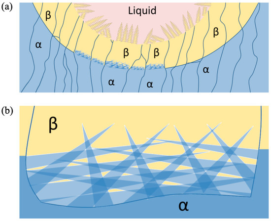 (a) A schematic of the events: liquid to solid β, solid β to solid α. (b) A schematic of acicular morphology of α transformed at high cooling rates.