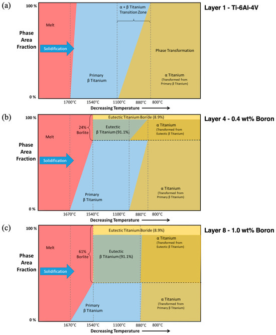 Phase area fraction expressed as a function of decreasing temperature through solidification and phase transformation for (a) Layer 1Ti-6Al-4V, (b) Layer 4—0.4 wt.% Boron, and (c) Layer 8—1.0 wt.% Boron.