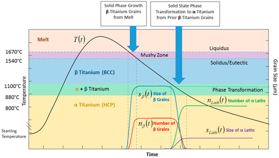 The stereology of the microstructural features generated in a single temperature passage through the phase transition zones (shown in Figure 13) is dependent on the cooling rate. In Figure 14, the black line shows the temperature profile of a point increasing into the melt zone and then decreasing through solidification and phase transformation. Figure 14 illustrates how the number density (ηβ) and size (sβ) of the β-titanium grains increase; later, the ηβ and sβ decrease as the number density (ηLath) and size (sLath) of α-laths increase consuming the β-grains. For a given volume fraction of β-titanium grains, the number and size will be determined by the cooling rate.