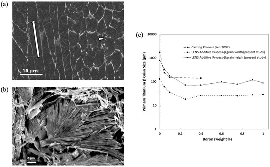 Scanning Electron Micrograph (SEM) of titanium boride eutectic regions < 0.1% boron. (a) Long white arrow indicating adjacent primary titanium dendrite arms decorated by eutectic TiB. Short white arrow shows the transverse section of adjacent dendrite arms enlarged in (b) after deep etching to remove the titanium matrix. TiB whiskers are shown following primary dendrite arm cells. (c) Primary titanium β-grain size as a function of boron composition comparing additive manufacturing (LENS) results from the present study to that of casting (skull melt process) [41]. Please note that the initial grain size is related to the grain size of the base material, which increased due to heating.