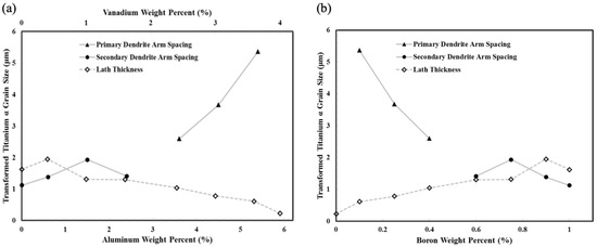 Transformed titanium α-lath thickness, average primary and secondary dendrite arm spacing measured with respect to (a) aluminum and vanadium composition by wt.% and (b) boron composition wt.%. When both primary and secondary dendrite arm spacing is observed, the smaller of the two are plotted.