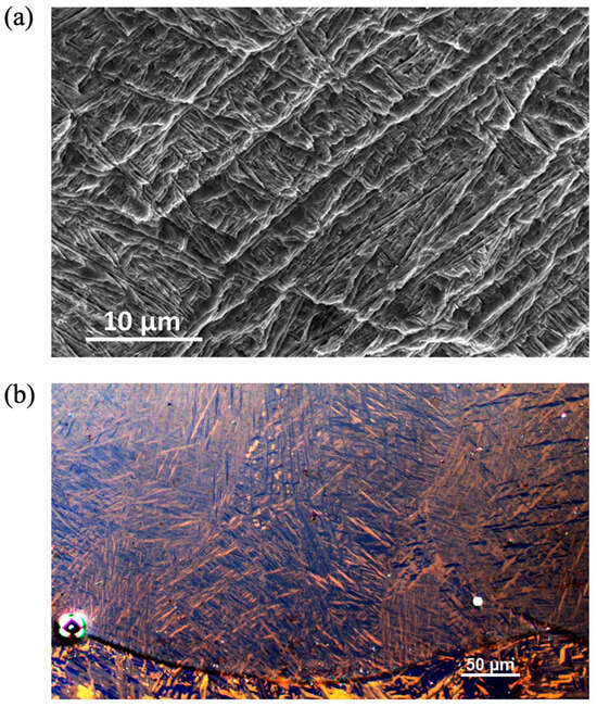 (a) A scanning electron microscope image of LENS deposited Ti-6Al-4V region from Layer 1 after deep etching with nitric acid. Transformed titanium α-laths forming a wedge-shaped pattern. (b) A polarized light optical micrograph of Ti-6Al-4V Layer of similar region.