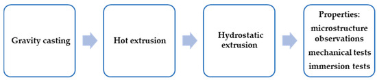 In an attempt to determine what effect the applied plastic processing has, the various compositions described above were subjected to hot extrusion at 250 °C. The final stage of material preparation was a hydrostatic extrusion carried out at room temperature in two passes with cumulative strain εcum  =  1.4. Hydrostatic extrusion is a method of extrusion of the billet under high pressure in the liquid environment conducted in HE-presses able to operate at pressures up to 2.5 GPa designed and constructed at the Institute of High Pressure Physics Polish Academy of Science.