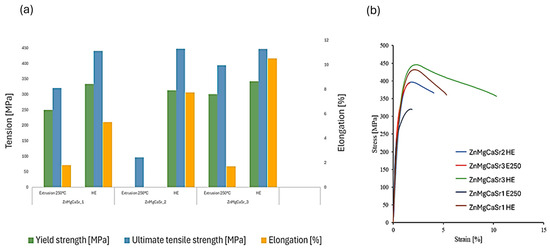 Figure 3. Mechanical properties (a) (yield strength, ultimate tensile strength and elongation to failure) with exemplary strain-stress curves (b) obtained for ZnMgCaSr_1, ZnMgCaSr_2 and ZnMgCaSr_3 after hot extrusion (E250) and hydrostatic extrusion (HE).
