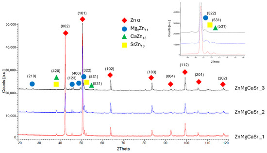Figure 4. XRD diffractogram of Zn alloys with different compositions ZnMgCaSr_1, ZnMgCaSr_2 and ZnMgCaSr_3, with marked peaks from intermetallic phases and pure zinc and insert with higher magnifications.