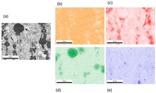 Figure 5. Exemplary high magnifications EDS/EBSD analysis of the investigated Zn alloys with (a) IQ map and elements distribution maps of Zn (b), Mg (c), Ca (d) and Sr (e).