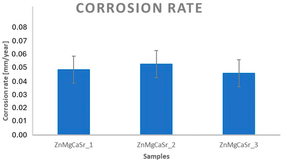 Figure 10. Diagram of corrosion rates calculated for ZnMgCaSr_1, ZnMgCaSr_2 and ZnMgCaSr based on immersion tests.