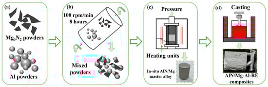 The processing schematic for the AlN/Mg-Al-RE composites: (a) Raw powders; (b) ball milling; (c) hot pressing sintering; (d) casting.