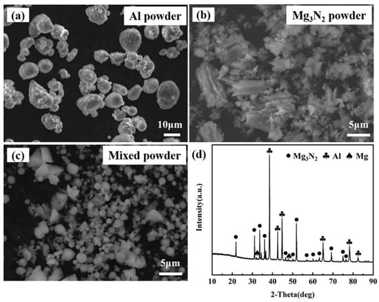 SEM diagrams of raw powders: (a) Al powder; (b) Mg3N2 powder; (c) mixed powders after ball milling; and (d) XRD pattern of (c).