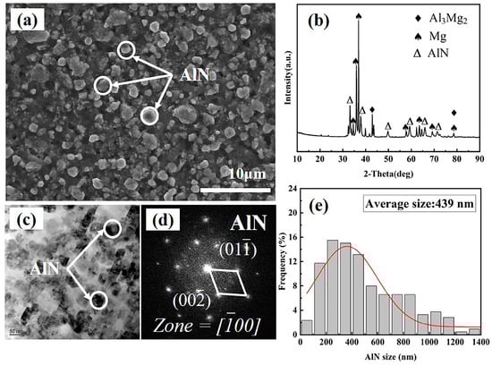 Microstructure of sintered AlN/Mg master alloy: (a) SEM image; (b) XRD pattern; (c) TEM image; (d) SAED image; (e) statistical diagram of AlN particle size.