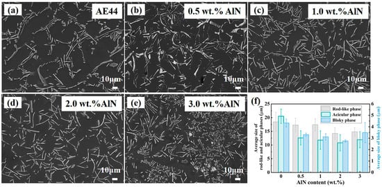 SEM microstructure of AlN/AE44 composites with different AlN contents: (a) AE44, (b) 0.5 wt.% AlN, (c) 1.0 wt.% AlN, (d) 2.0 wt.% AlN, (e) 3.0 wt.% AlN, and (f) second phase size statistics.