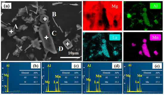 (a) SEM image and EDS mapping results of second phases in 3.0 wt.% AlN/AE44 composite; (b–e) EDS point analysis of A—AlN, B—Al8Mn5, C—Al8Mn5, D—Al8Mn5.