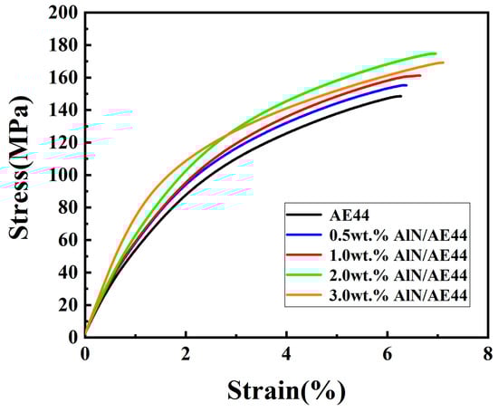 Tensile stress–strain curves of AlN/AE44 composites with different AlN contents at room temperature.