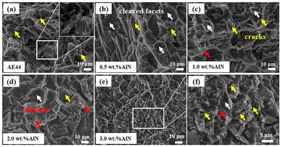 Tensile fracture morphologies of AlN/AE44 composites with different AlN contents at room temperature. (a) AE44; (b) 0.5 wt.% AlN/AE44; (c) 1.0 wt.% AlN/AE44; (d) 2.0 wt.% AlN/AE44; (e) 3.0 wt.% AlN/AE44; (f) partial magnification of (e).